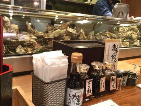 カウンターのガラスケースの中には、殻付き牡蠣がゴロゴロしてます。