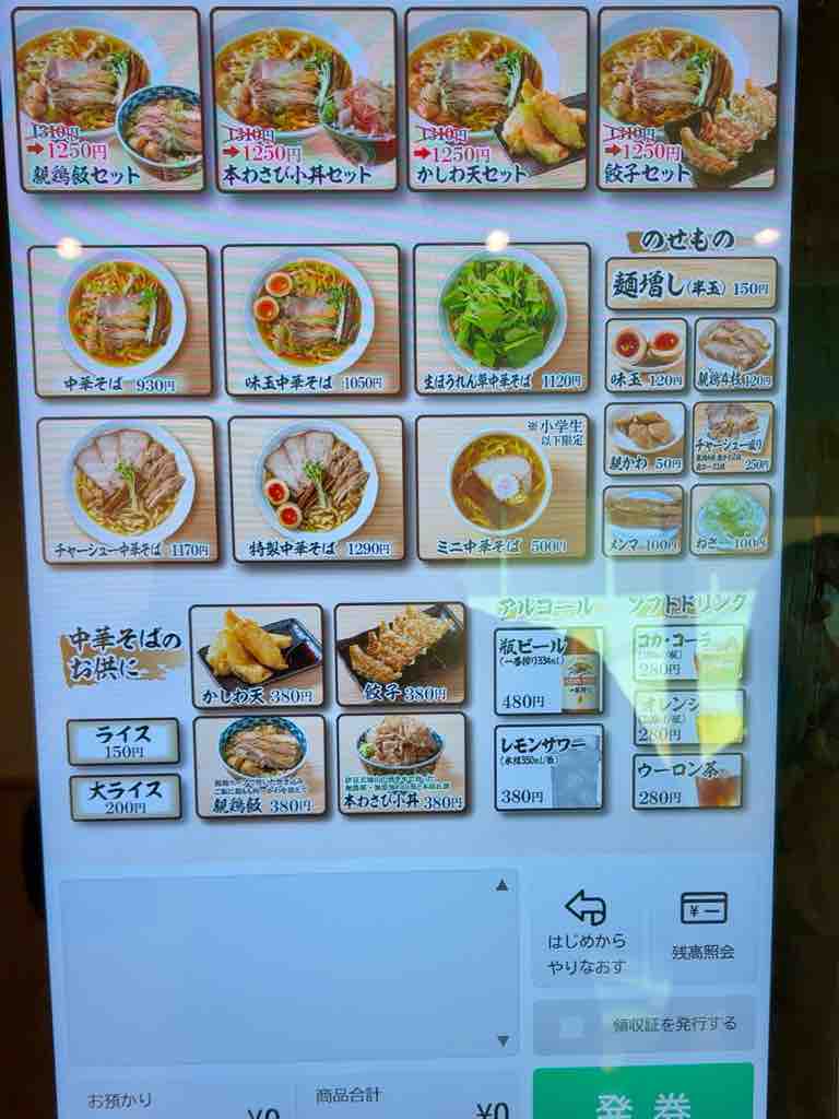 10分ほど待って中に通され、券売機で券を買うように促されます、券を買っても案内にまた待たされます券売機は、まず醤油味が塩味かを選び、それぞれのメニューに飛ぶ大型タッチパネル