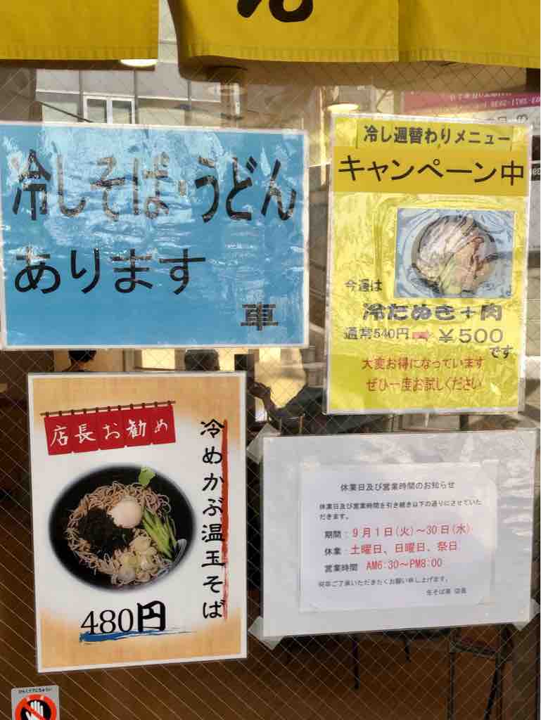 目白と言う文教地区的な街の佇まいのなか、駅前蕎麦だけど小綺麗ですね。生そばでやってる立ち蕎麦です。中は結構広いですね。ファサードも深さがあります。今週の冷し週替わりメニューは、冷たぬき+肉 540円→500円。