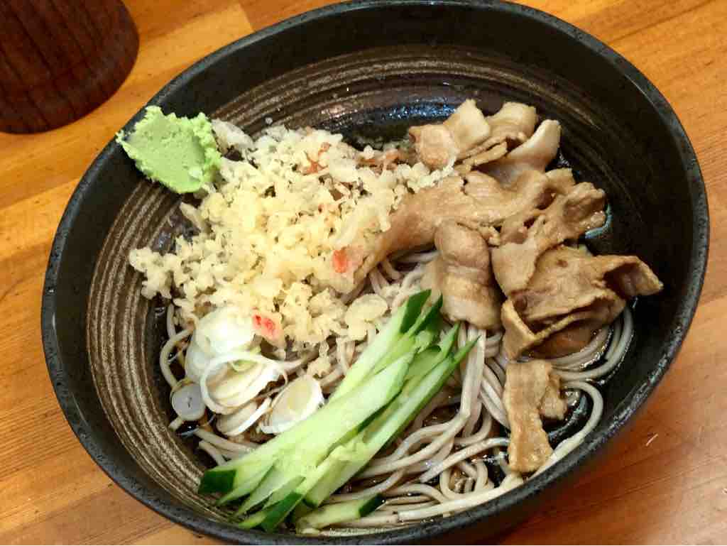 しっかりと蕎麦を冷して盛り付け。蕎麦半分ですから少し見た目は貧弱ですが、ヒヤタのきゅうりとタヌキ、肉が、バランス良く盛り付けられています。
