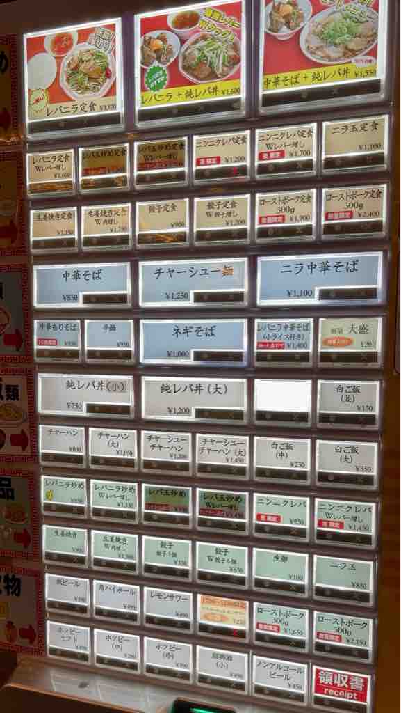 単品でお願いしましょう、レバニラ炒めWレバー増し 1350円、餃子3個 350円、レモンサワー 490円をポチり、お兄さんに券を渡して又並びます