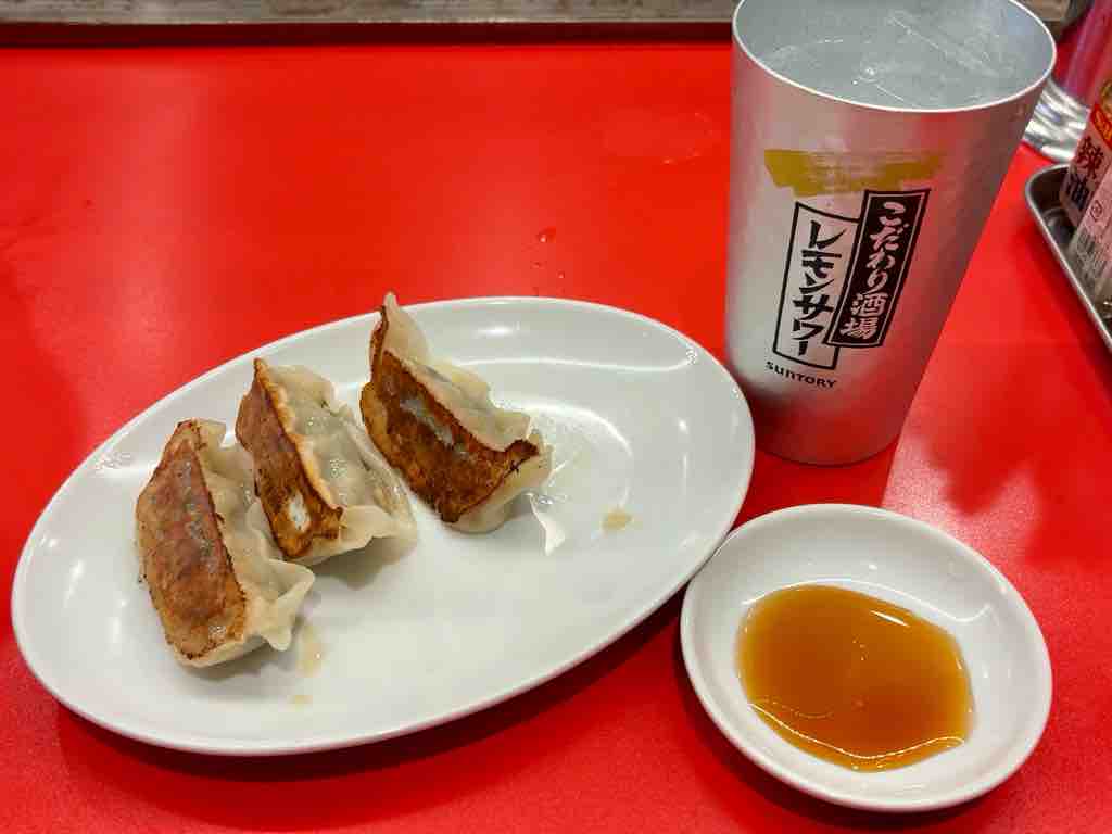 先に餃子とレモンサワーが登場そこそこ大きさのある餃子は、パンチ弱目ですがジューシーで美味しいですね