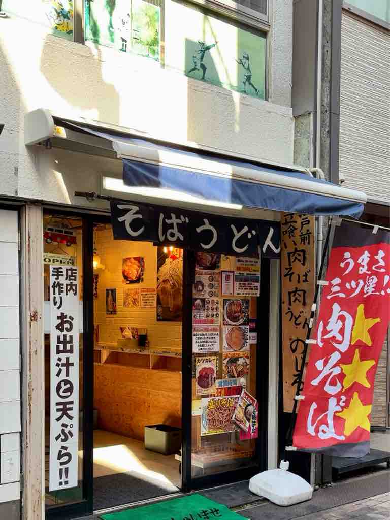 十条駅から昔ながらの商店街十条銀座西通りから、十条仲通りに入りしばらく行くと肉そばの赤い幟がはためきます