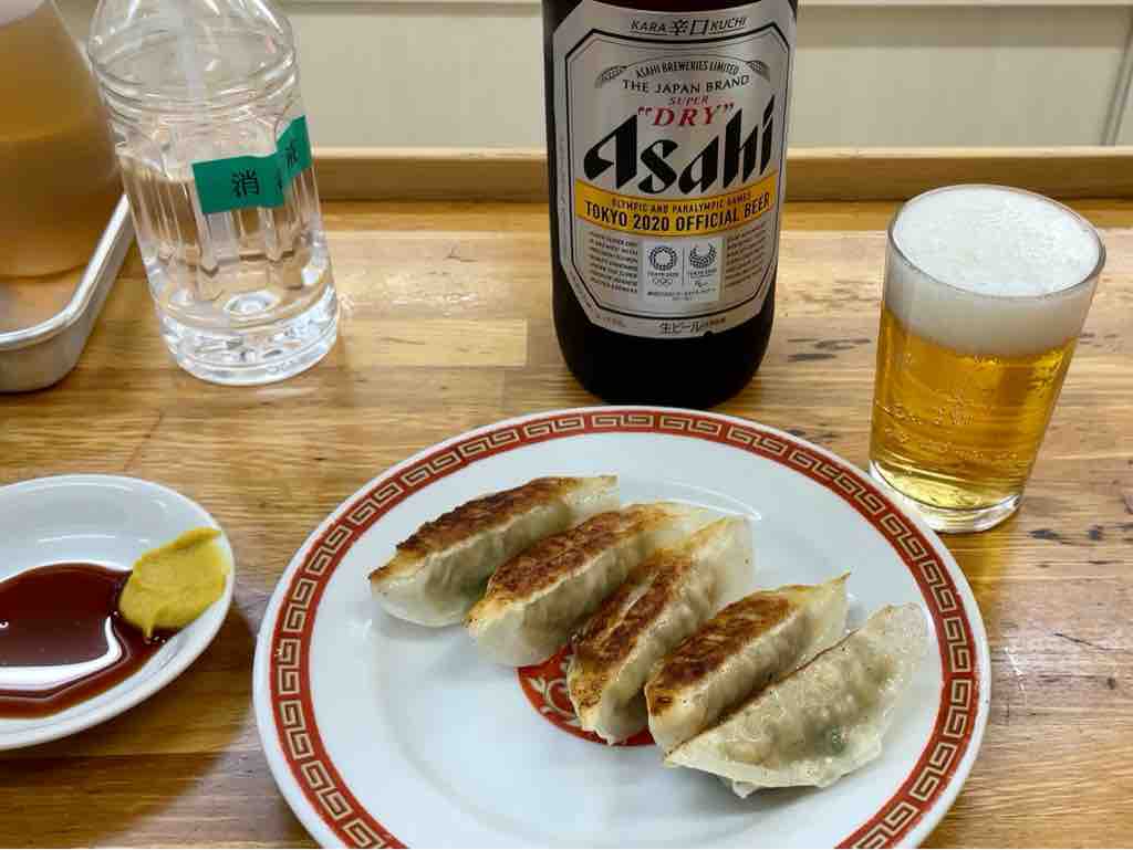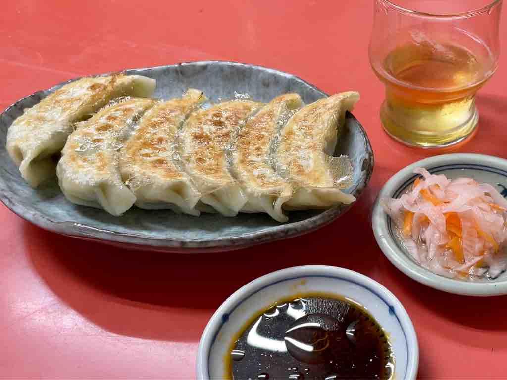 ひだの数が多いモチモチした皮の中には、ニンニクのパンチが効いた餡がしっかり。美味いですね。餃子はこれでなくちゃ。帰りの電車は皆さんごめんなさい。